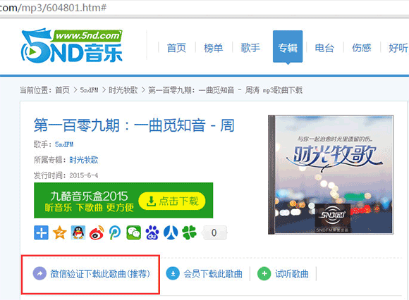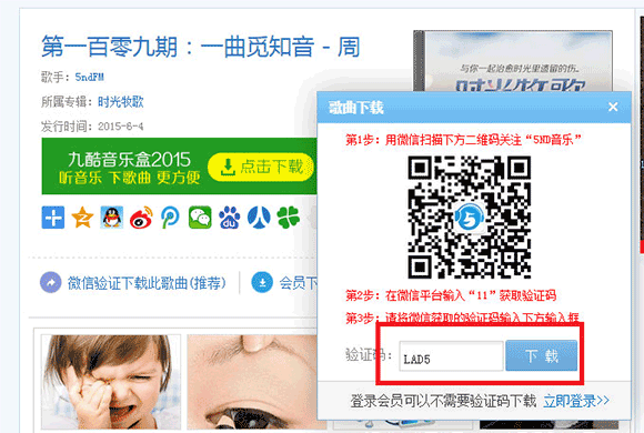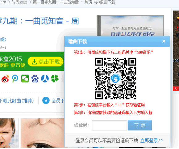 如果下载页面显示的是:“微信验证下载此歌曲(推荐)”,这证明您没有通过微信获取验证码。如下“图一”