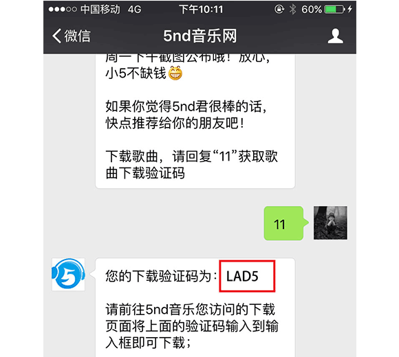 关注后会进入“5nd音乐网”微信公众号,然后输入“11”,如下“图五”。
